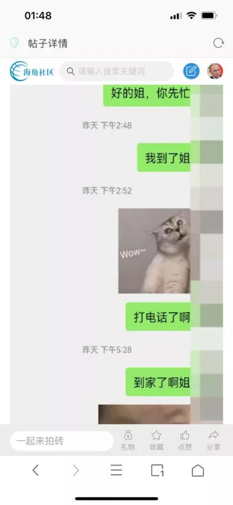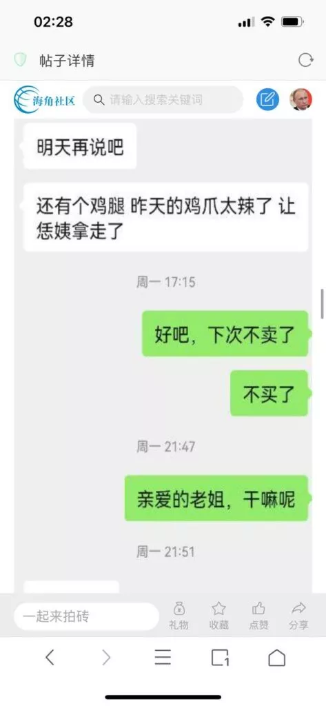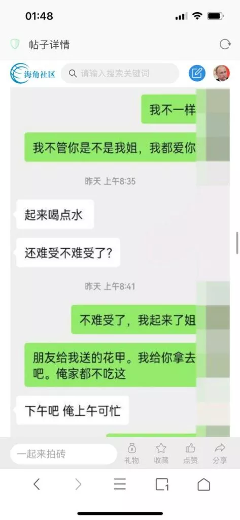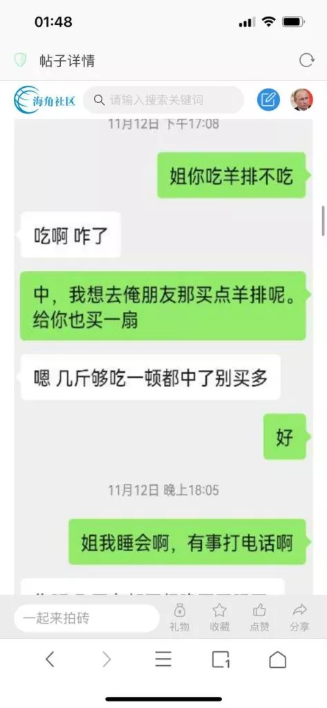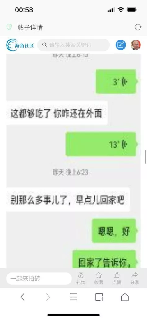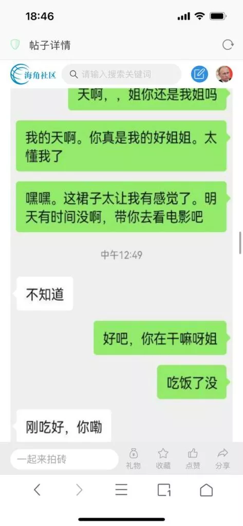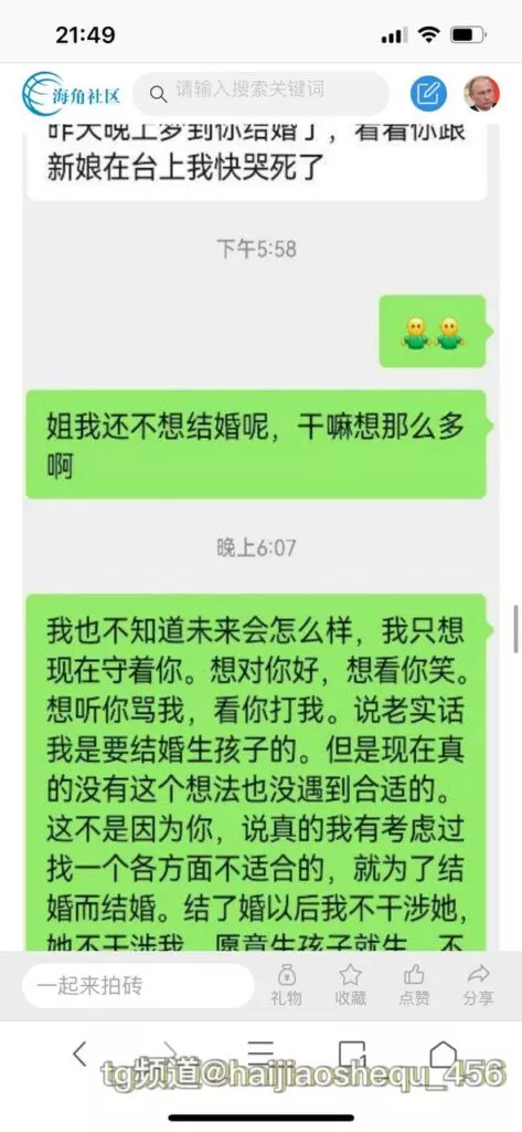 今天看电影也在犹豫要不要发一个视频。但也是我的锅,前几天晚上喝多了跟一个加我微信的海友打了微信电话,haijiaoshequ_456天南海北聊了快一个小时,脑子一热就答应了有机会再发一个帖。