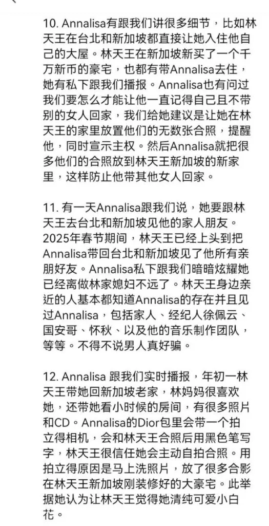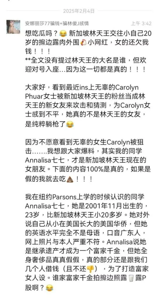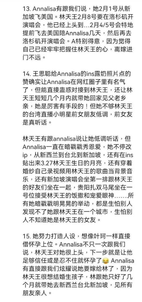 沉寂已久的娱乐圈再次爆出劲爆新闻,曾经的乐坛天王林俊杰被爆料与一位出生于2001年的女友annalisa交往,二人年龄相差整整20岁。据内幕人士透露,这位新任女友曾是一名地下福利姬,即外围女,大量想关黑料被曝光,不知道林俊杰得知真相后还能不能淡定。