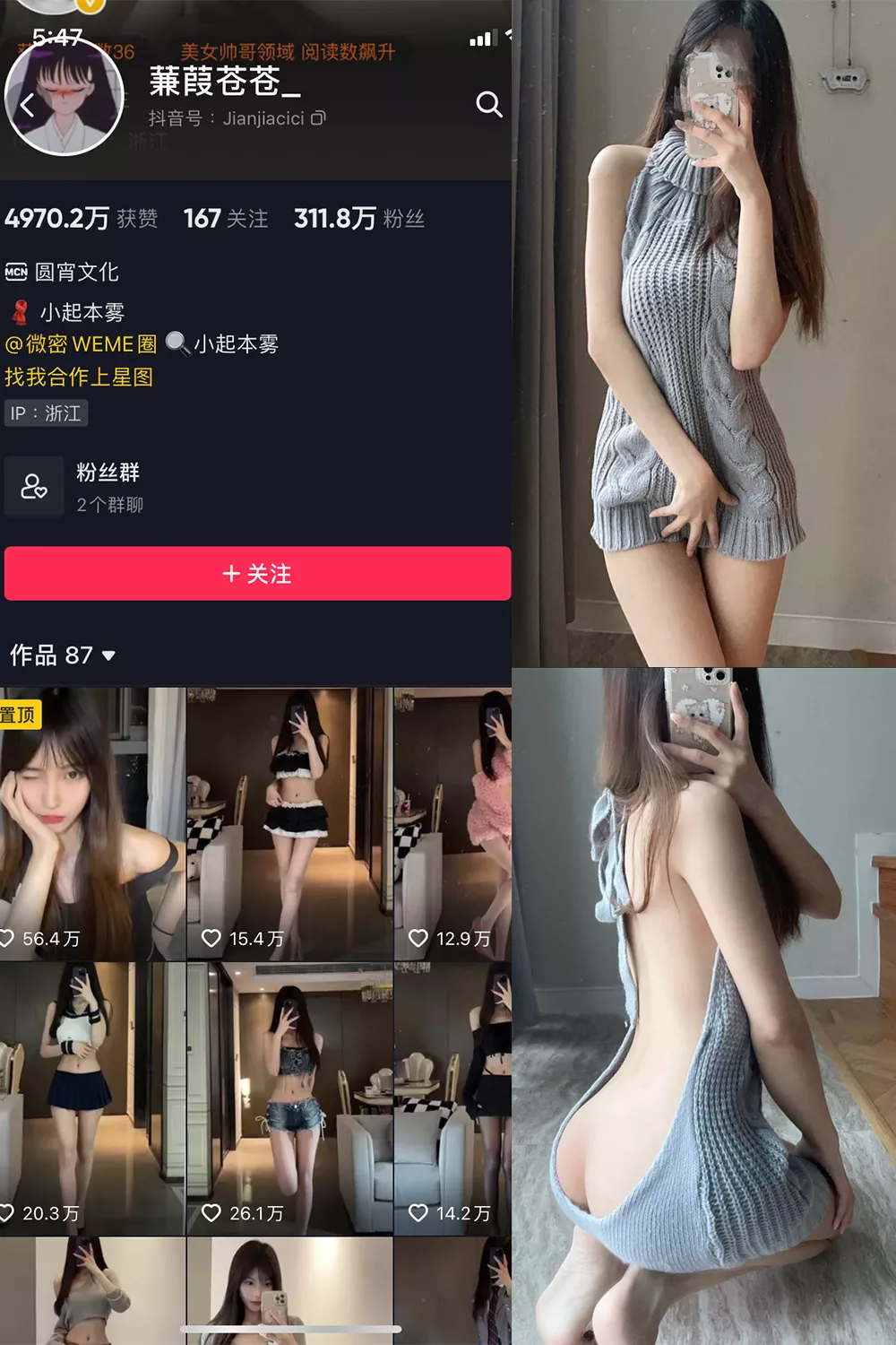 蒹葭苍苍身穿一件灰色针织背心裙,宛如走出了时尚杂志的封面,曲线美得让人心动不已。独特的设计和柔软的材质相结合,仿佛在说:“来吧,让我成为你视线的焦点!”露肩的款式与背部深V剪裁,简直是性感与优雅的完美结合,仿佛在邀请你一起加入这场时尚盛宴。