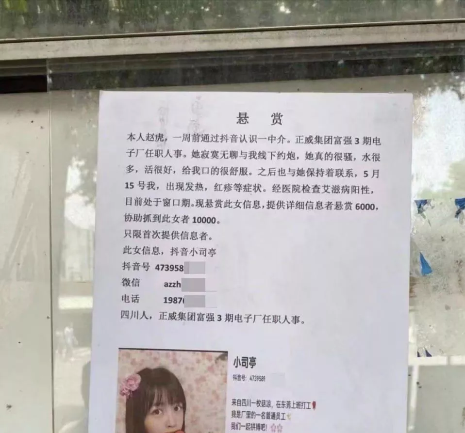 抖音主播小司亭近日在街头被张贴悬赏令。据悉,她目前在东莞正威集团富强三期担任人事一职。根据一名男子的爆料,称他与小司亭在线下发生过关系,随后出现了一些艾滋病的症状。经过医院检查,结果显示他感染了艾滋病。这一事件引发广泛关注。