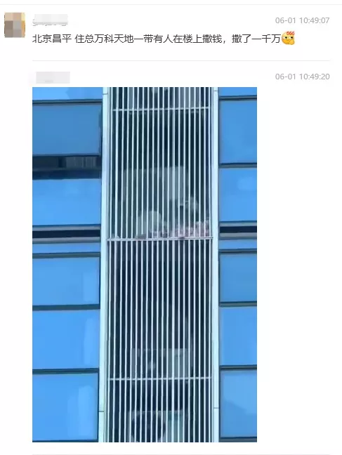 不慎错失了一次发财良机,近日有消息称在北京昌平的万科天地,一位富豪从高楼向下狂撒一千万人民币,吸引了路过的市民疯狂抢夺。