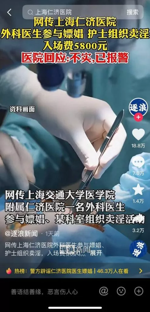 近日,有网络传言称上海交通大学附属医院仁济医院的外科医生参与嫖娼,更有爆料指称该医院某科室涉嫌集体组织卖银活动。据悉,仁济医院内部调查发现ICU科室的一名护士确实存在组织卖银行为,并为外科医生提供性服务,甚至涉及多人银乱聚会。对此,仁济医院迅速发表声明,强调这些消息为不实信息,极有可能是谣言。